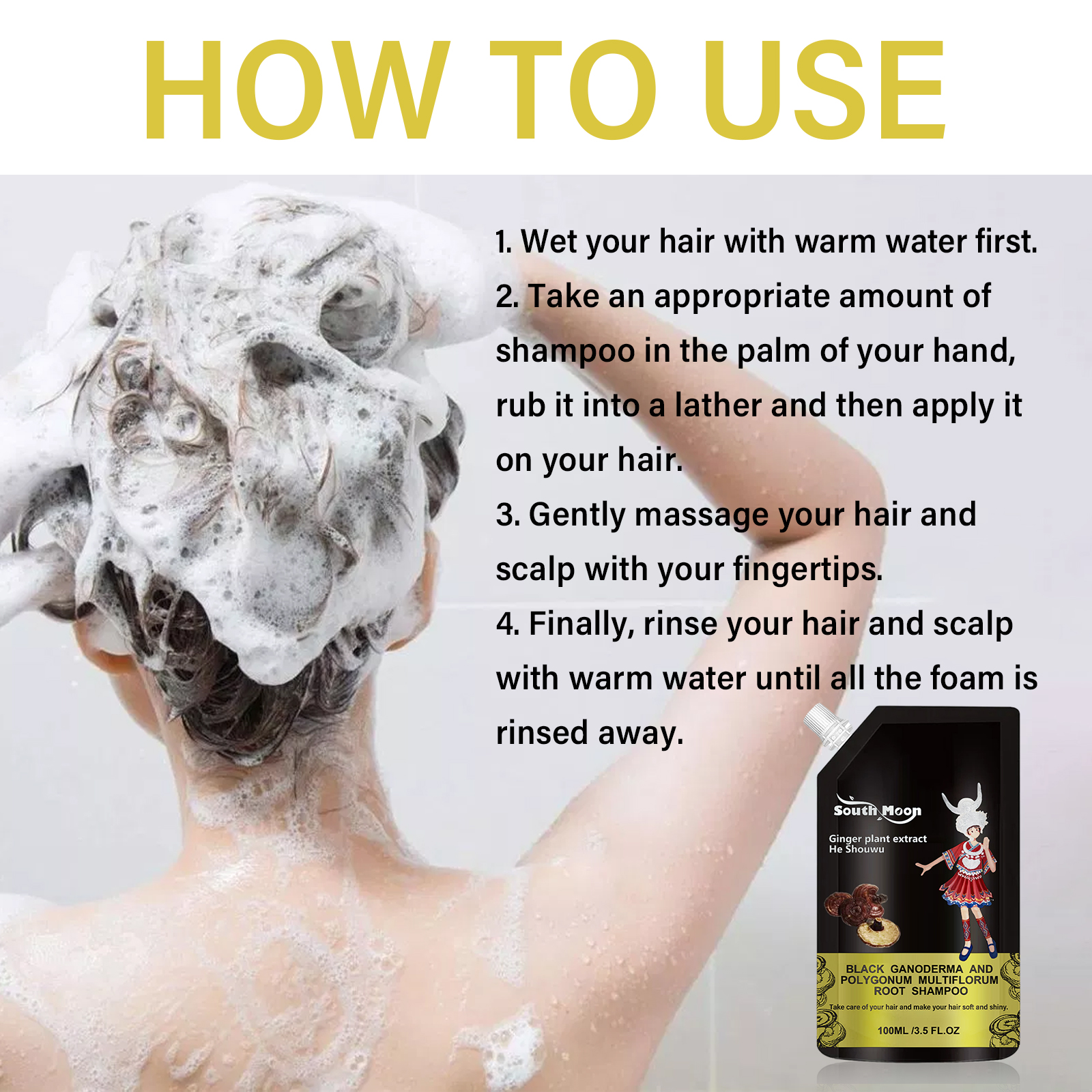 Our hair shampoo contains polygonum multiflorum extract, ganoderma lucidum stem extract, ginger extract. It prevents hair loss and promotes thicker, firmer hair naturally. Effectively protects the scalp and provides you with enough moisture to support healthy hair. The way to use it is simple: 1. Wet your hair with warm water first. 2. Take proper amount of shampoo in the palm, rub to lather, then apply to hair. 3. Gently massage your hair and scalp with your fingertips. 4. Finally, rinse your hair and scalp with warm water until all the foam is removed. Shampoo helps restore the thickness, strength and softness of your hair; Can make hair thicker, scalp healthier, dandruff is no longer a problem.