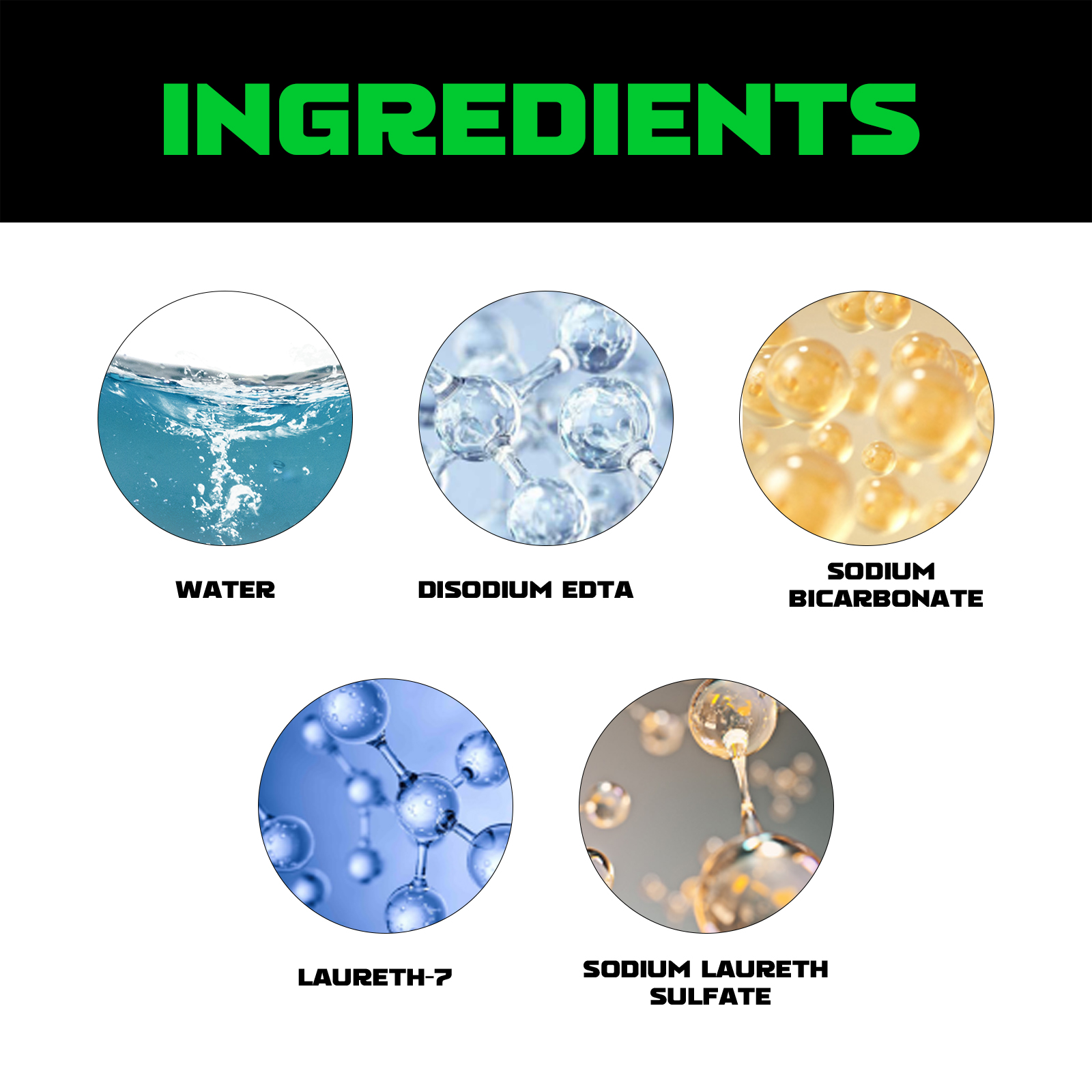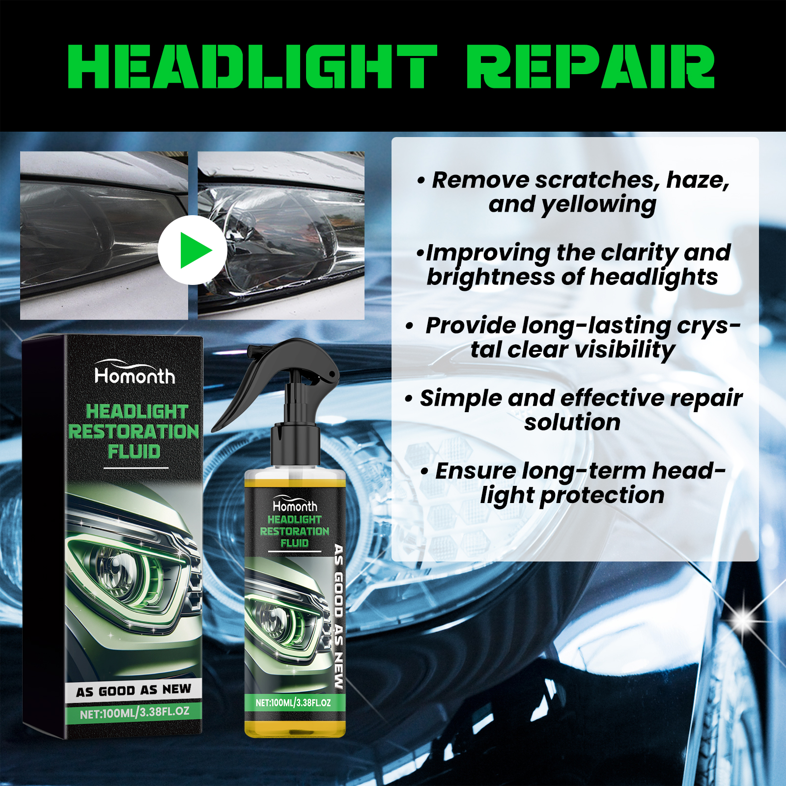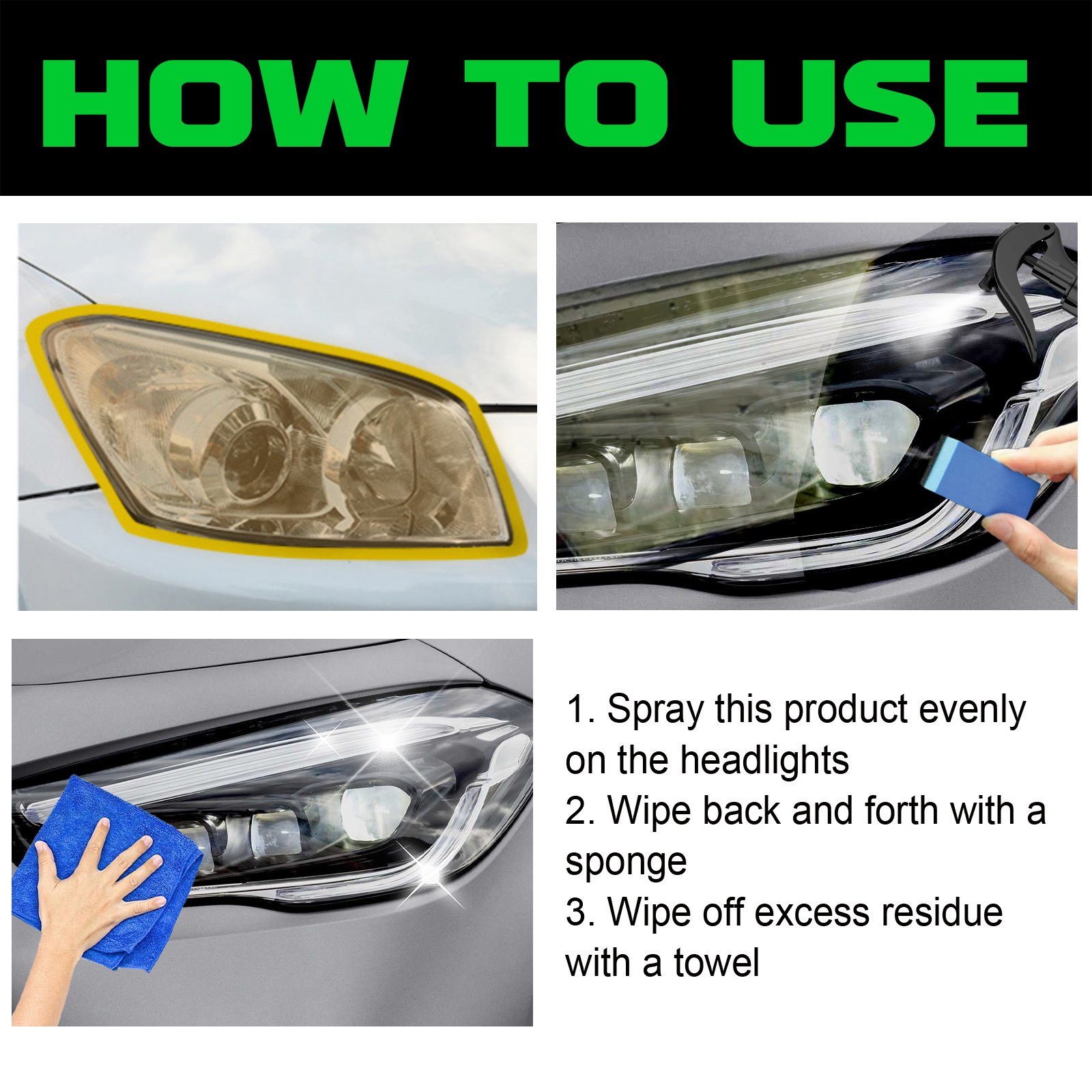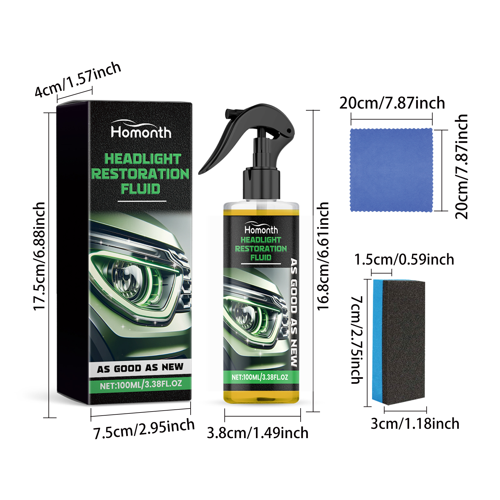 Our Headlight Restoration Fluid contains disodium EDTA, sodium bicarbonate, lauryl ether 7. It can help restore the appearance of car headlights and restore your car headlights to their original condition, remove headlights scratches and yellowing, improve headlight clarity and brightness, and provide long-lasting clear visibility. Its use method is very simple: spray the product evenly on the headlamp, wipe it back and forth with a sponge, and finally wipe off the excess residue with a towel. It can repair surface damage and make your headlights look smoother and more beautiful.