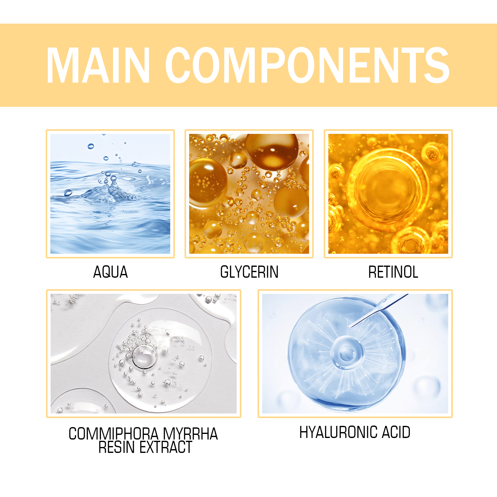 Our Instant Wrinkle Eraser contains Glycerin, Retinol, Commiphora Myrrha Resin Extract. It quickly fills in fine lines, wrinkles and pores, leaving skin instantly smooth and delicate. The way to use it is very simple: shake well before use, take a pea-sized amount, apply to the wrinkles on the face, gently pat until absorbed, wait 10-15 minutes. It can provide immediate and long-term results, allowing you to see noticeable improvements in a short period of time, while long-term use can achieve more lasting youthful skin, leaving skin glassy and radiating a healthy youthful glow.