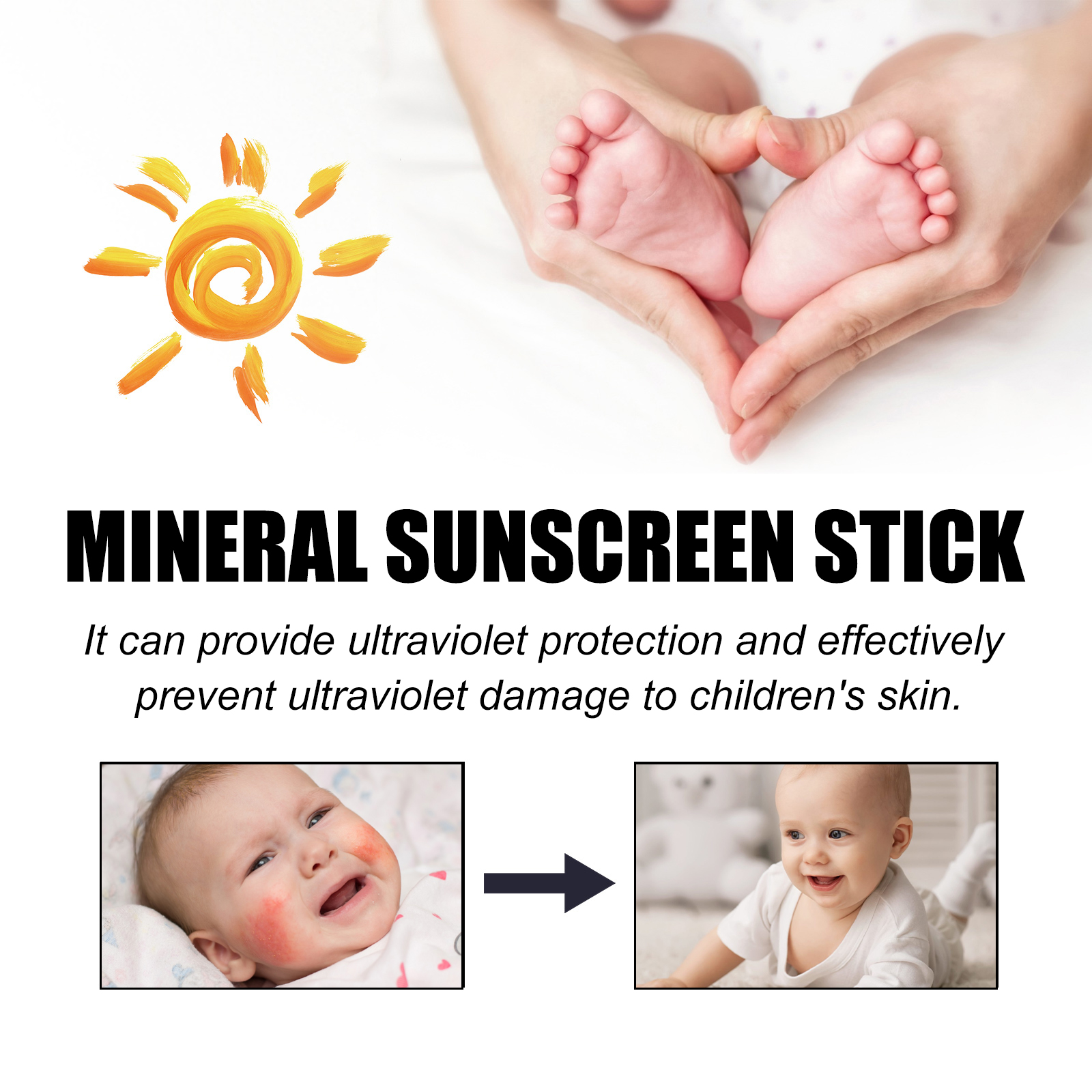 Our Mineral Sunscreen Stick contains Beeswax, Cocos Nucifera(Coconut)Oil, Olea Europaea (Olive) Fruit Oil. It can provide UV protection and effectively prevent UV damage to children's skin. Its application is simple: clean the skin, keep it dry, and evenly apply the product to the desired skin. Easy to slide and blend into the skin while protecting and moisturizing delicate skin.