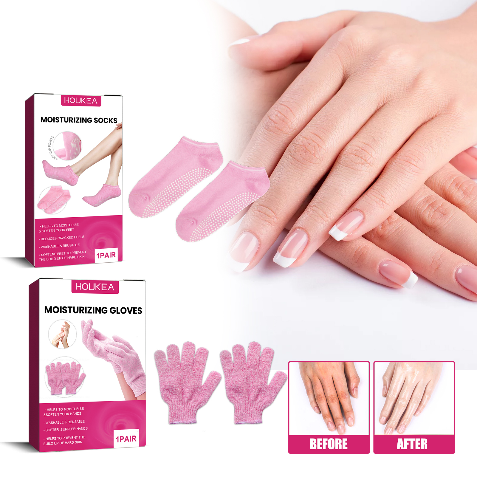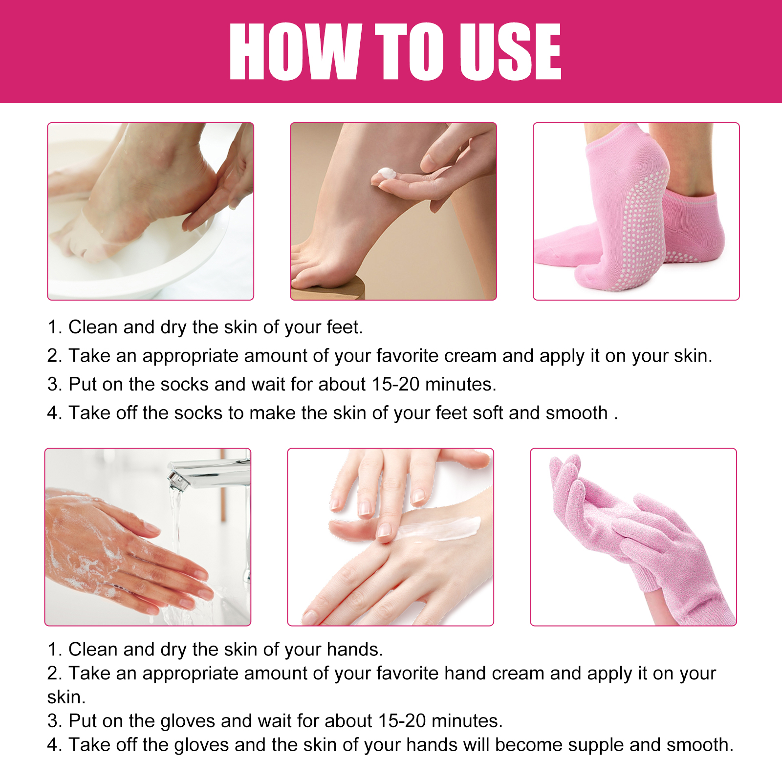 Our Moisturizing Gloves contain cotton fibers. It can moisturise and soften your hands, washable and reusable, softer, suppler hands, helps to prevent the build up of hard skin. Its application method is very simple: Clean and dry the skin of your hands. Take an appropriate amount of your favorite hand cream and apply it on your skin. Put on the gloves and wait for about 15-20 minutes. Take off the gloves and the skin of your hands will become supple and smooth. Protect the skin of your hands, lock in skin moisture, reduce evaporation, and help the skin of your hands become smoother and more elastic.