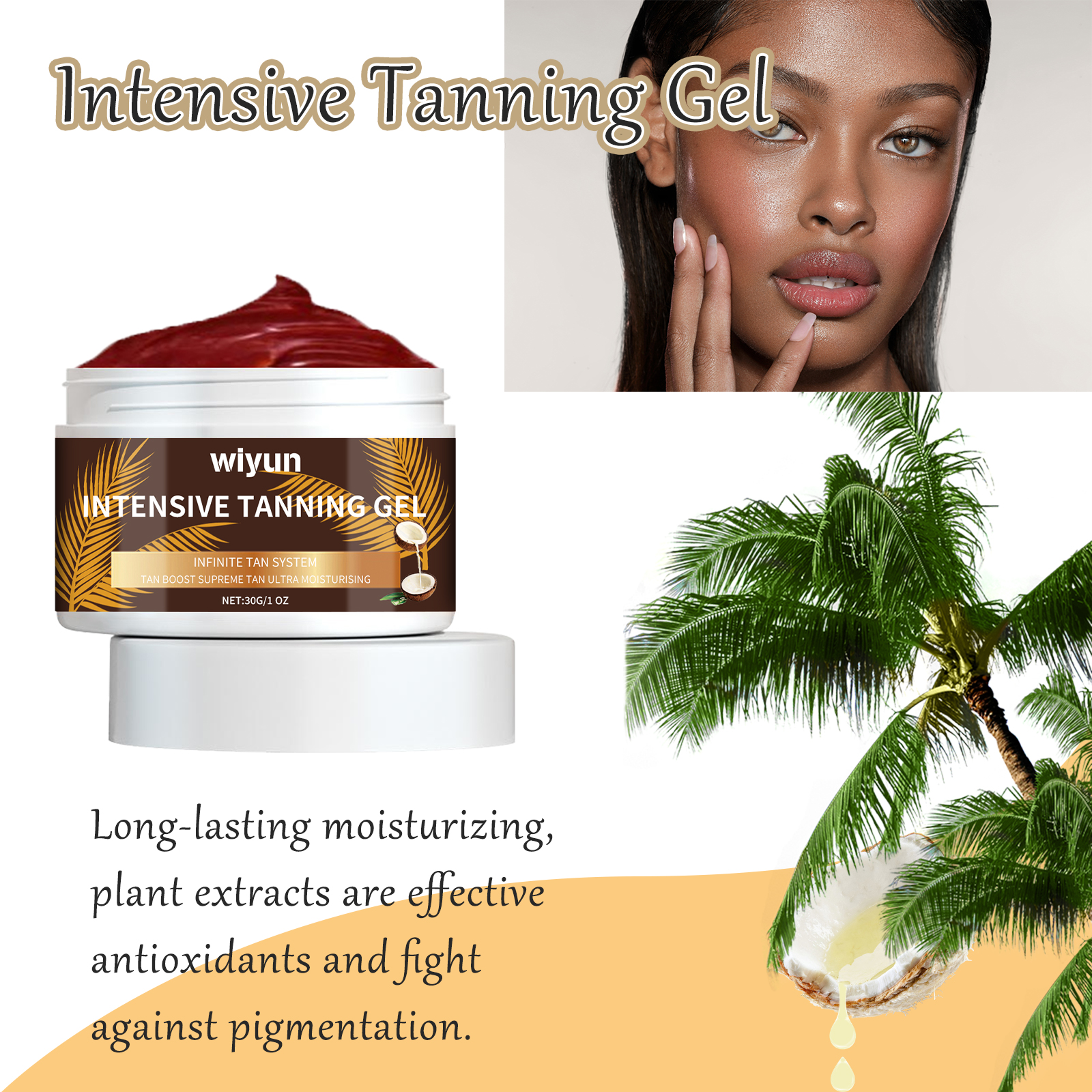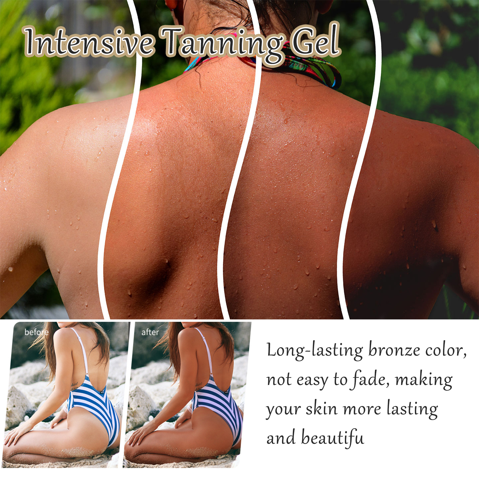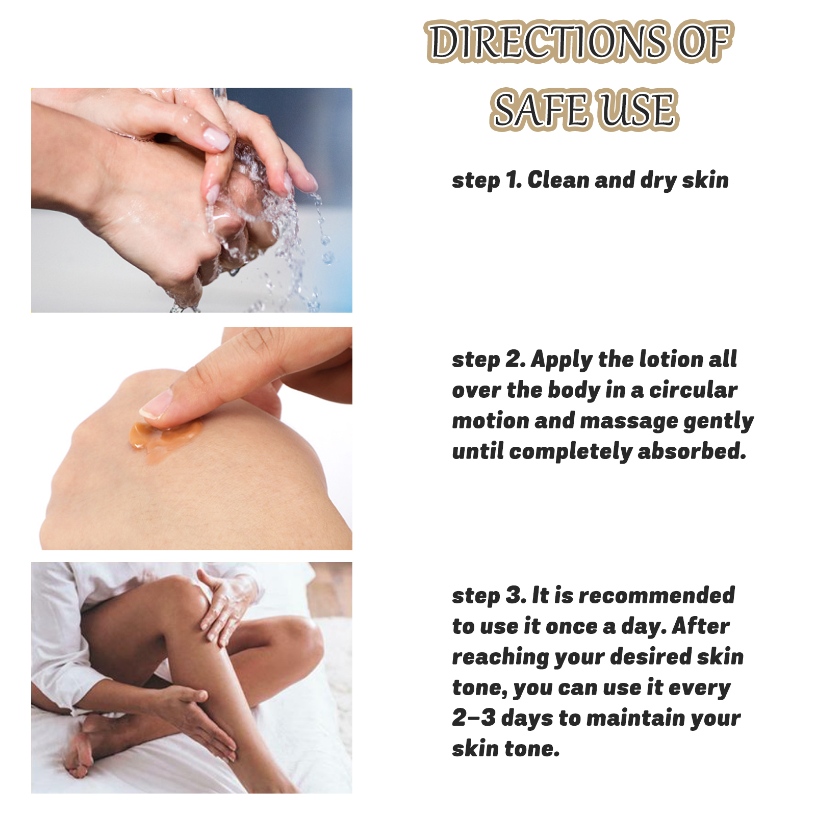 Our Black Repair gel contains coconut oil, walnut oil. It can correct the uneven skin tone, bring matte effect to the skin and improve the texture of the skin tone. The way to use it is very simple: the first step, clean dry skin. Second, apply the lotion to the whole body in a circular motion and gently massage until it is fully absorbed. The third step is recommended to use once a day. After reaching your desired skin tone, you can use it every 2-3 days to maintain your skin tone. It can also create natural summer tanning moisture, reduce wrinkles, obtain even tanning effect, and prevent skin aging caused by light.