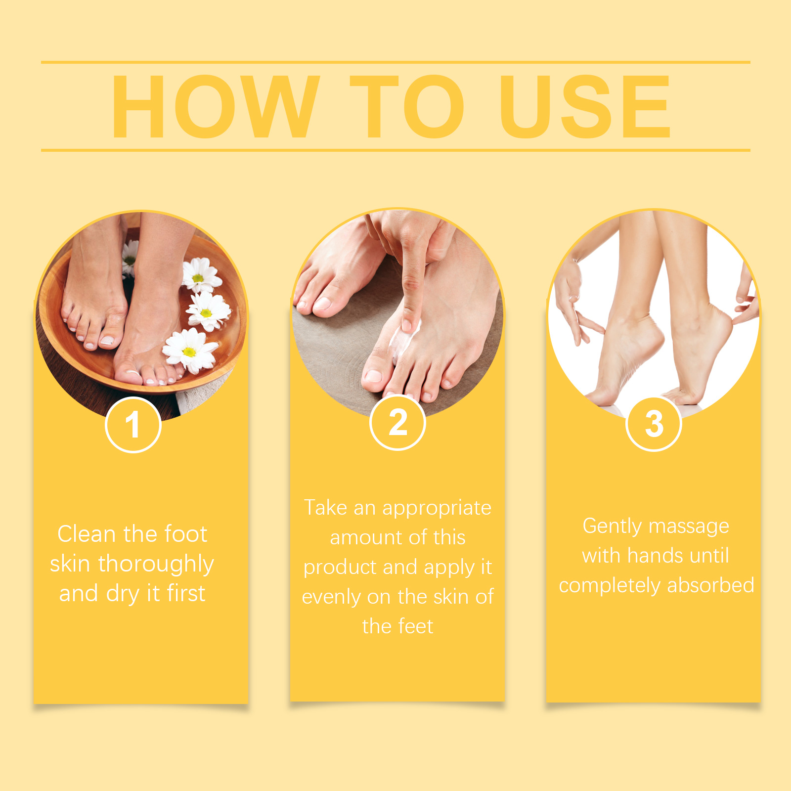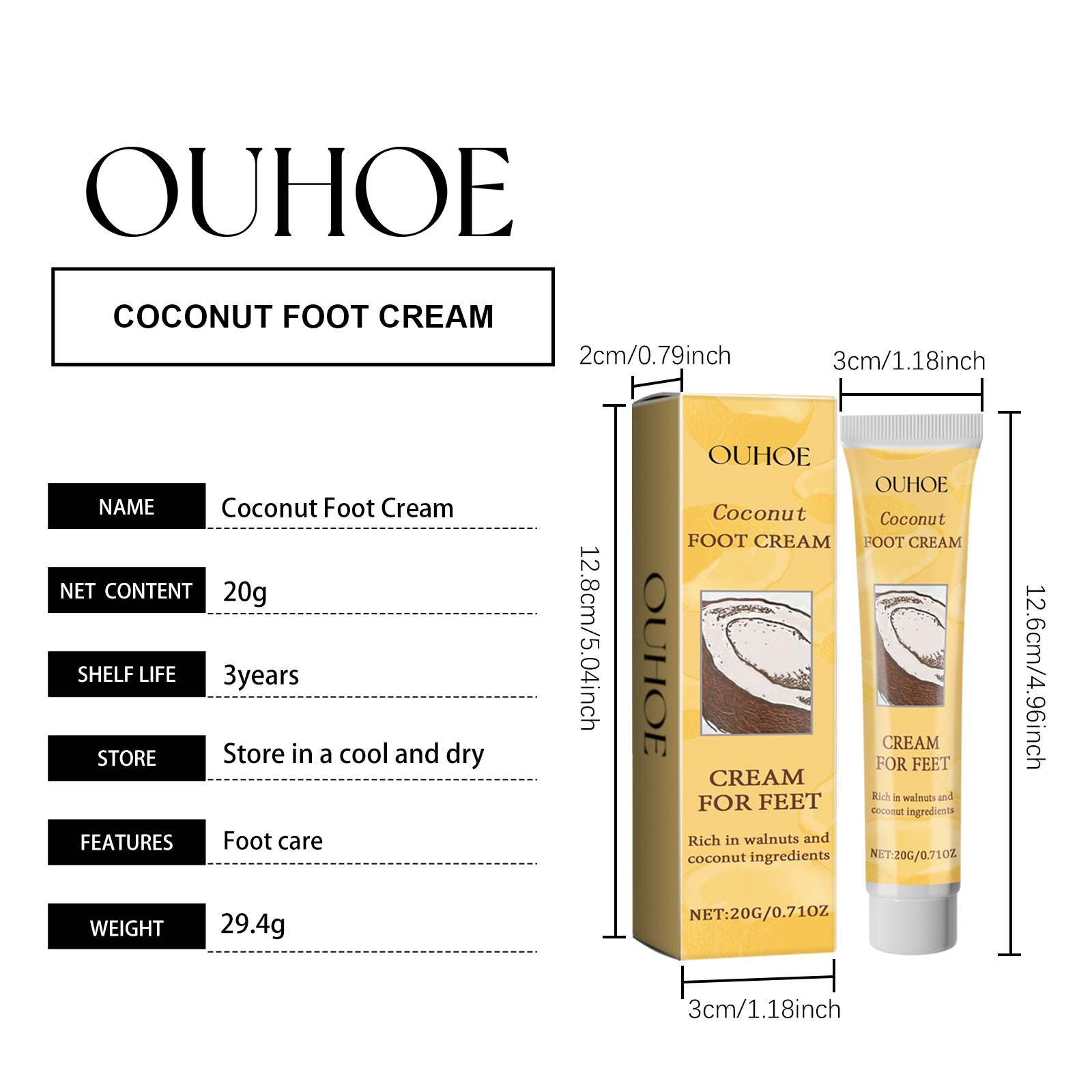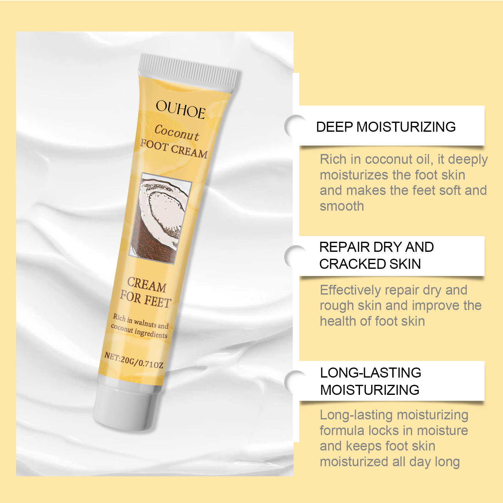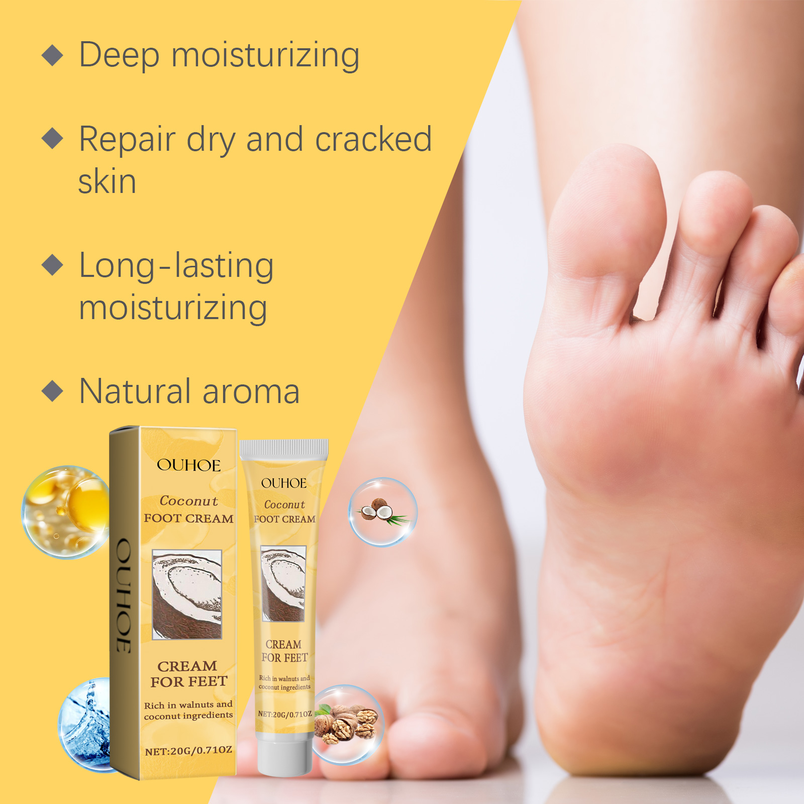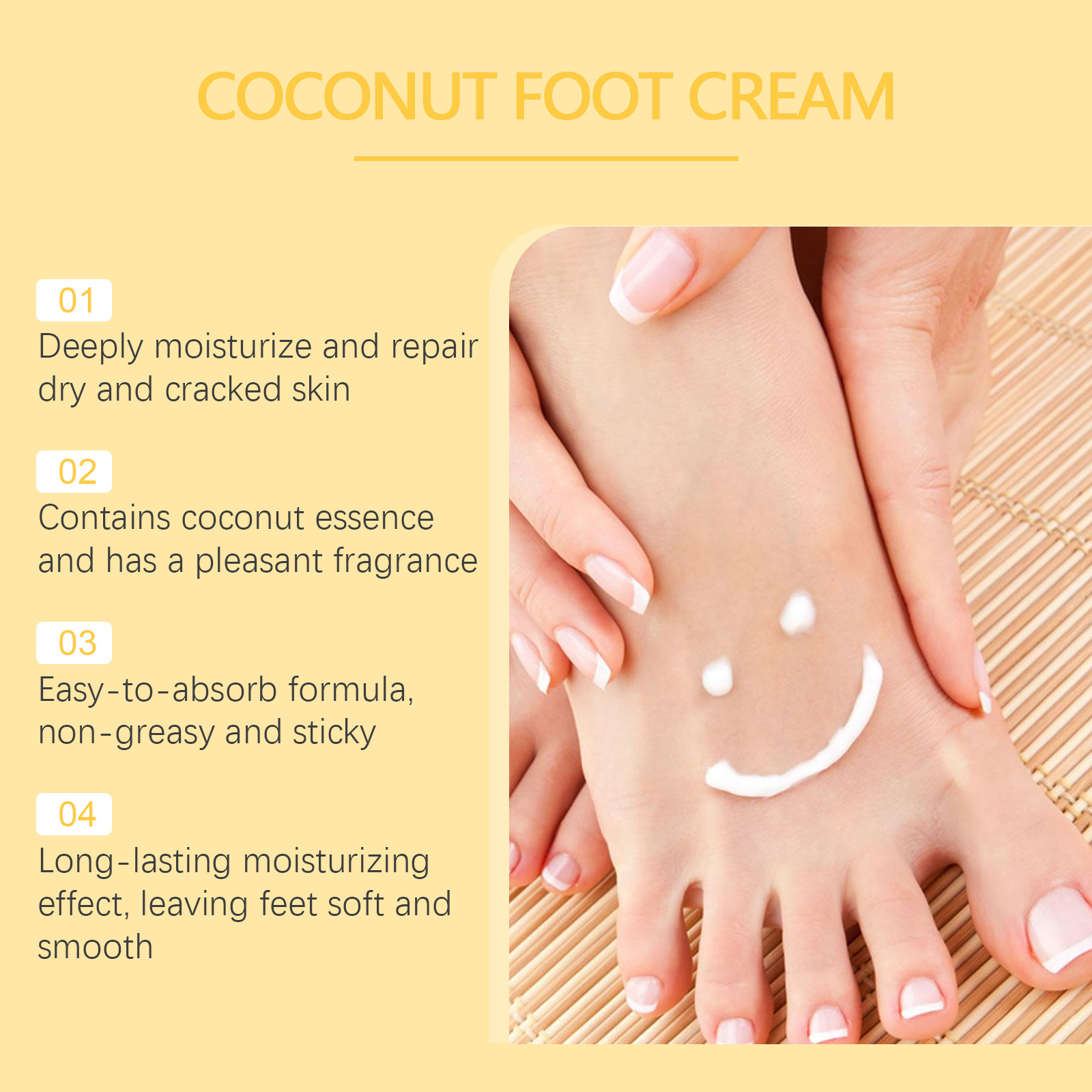 Our Coconut Foot Cream contains Cocos Nucifera(Coconut) Oil, Glycerin, Juglans Regia (Walnut) Seed Extract. It can repair the foot skin barrier, enhance the elasticity and luster of the foot skin, use daily, improve the texture of the foot skin, and make the foot softer and more delicate. Its use method is very simple: thoroughly clean the foot skin, dry it first, apply appropriate amount of this product evenly on the foot skin, gently massage with your hand until completely absorbed. Can prevent dry and chapped feet, especially suitable for use in autumn and winter.
