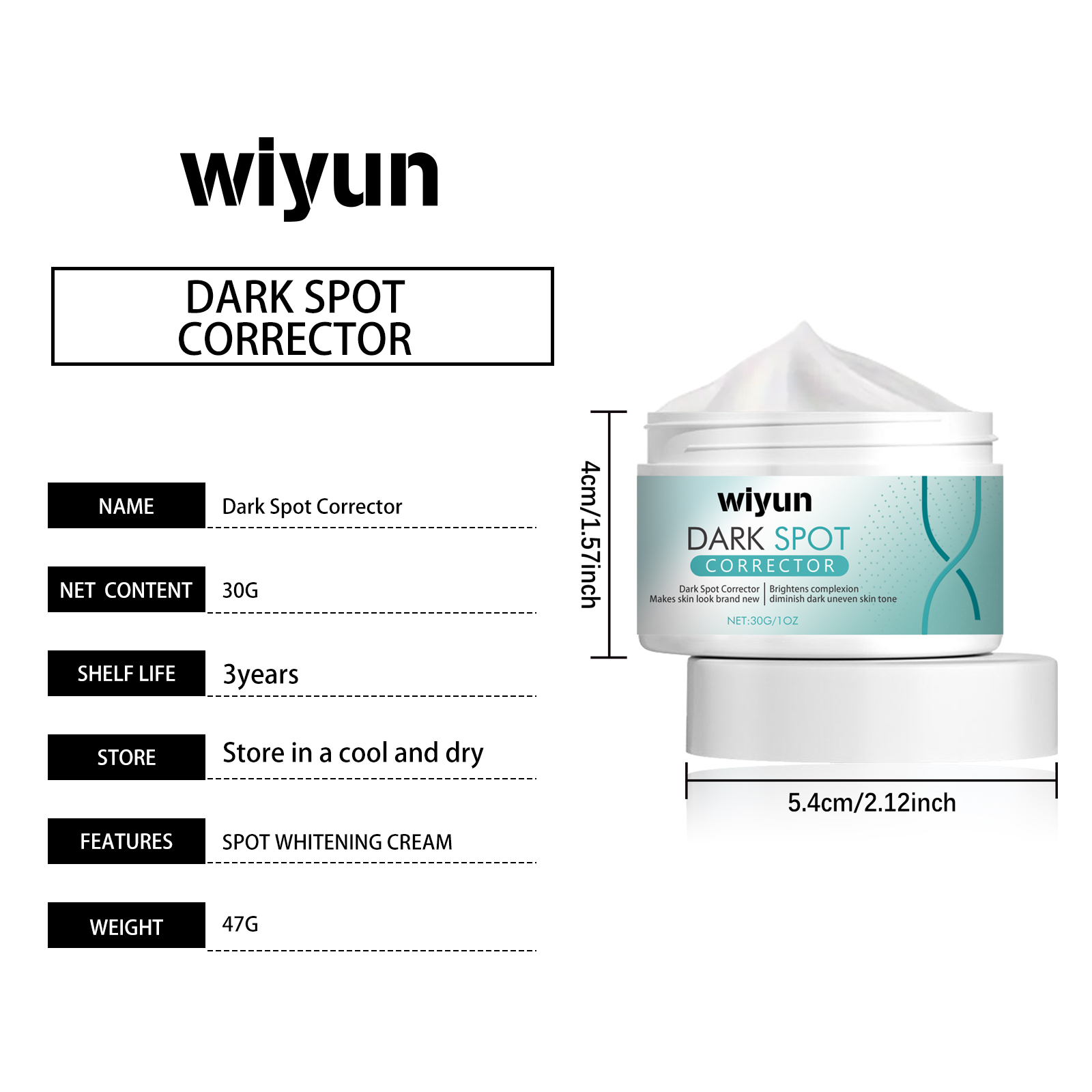 Our Dark Spot Corrector contains Hyaluronic Acid, Niacinamide, Coffea Arabica (Coffee)Seed Extract. It can improve the root cause of dark spots, make the skin even and translucent, lasting moisturizing and water retention, skin naturally moist and full, shining, fade dull, uniform brightening, restore skin luster, promote skin regeneration, make skin delicate and youthful and elastic. Its application method is very simple: clean and dry the face, take appropriate amount of correction cream, evenly apply on the face, gently massage until absorbed. It can promote collagen synthesis, increase skin elasticity, reduce fine lines and wrinkles, reduce pigmentation, and make skin more uniform and delicate.
