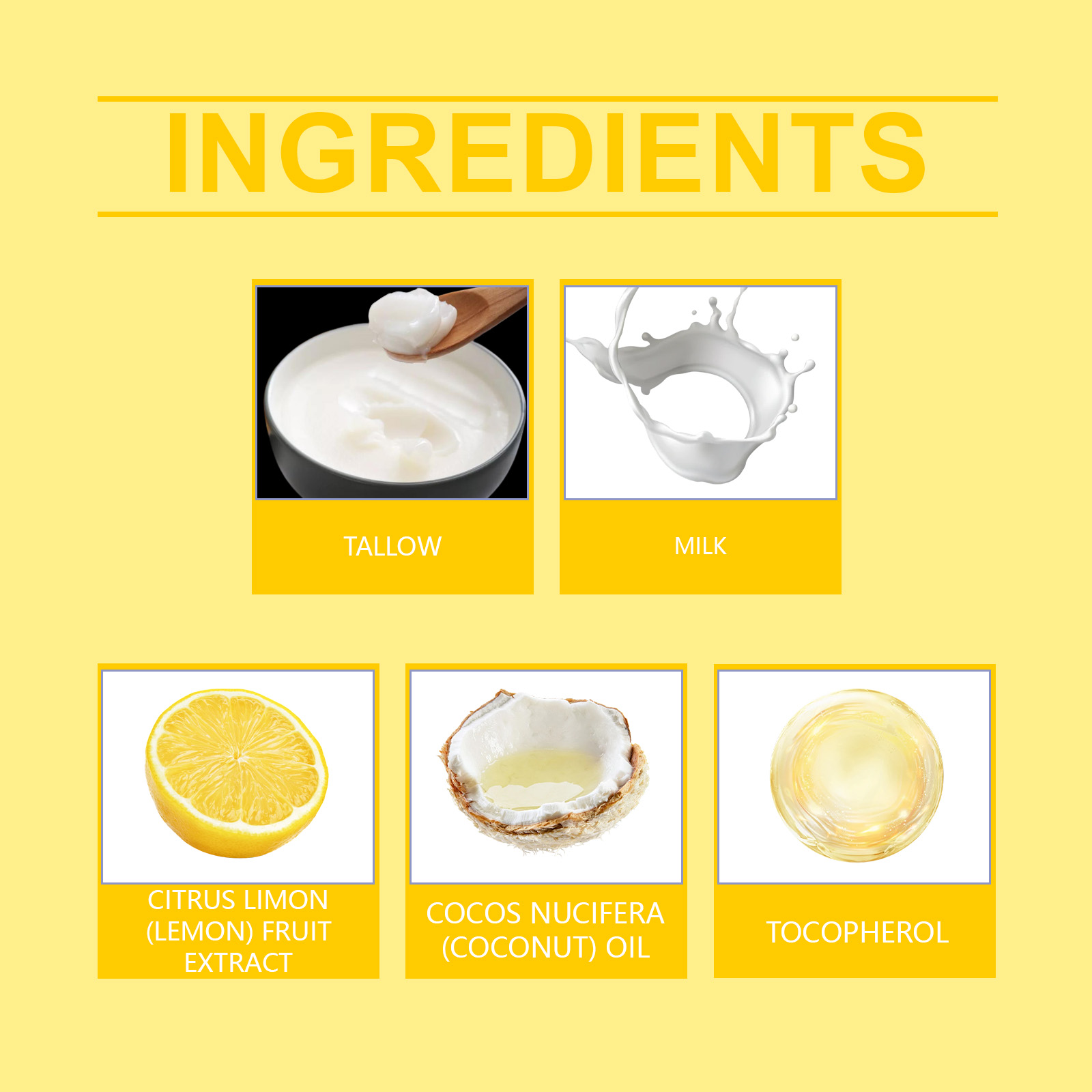 Our milk flavored tallow soap contains lemon extract and coconut oil. It cleans deeply, allowing pores to breathe freely. Its application method is very simple: wet the body with warm water, rub the soap in a clockwise direction to create a foam, spread the foam evenly on the body, clean the skin, and finally, rinse the body thoroughly with water. And can promote blood circulation, improve uneven skin tone, and enhance luster.