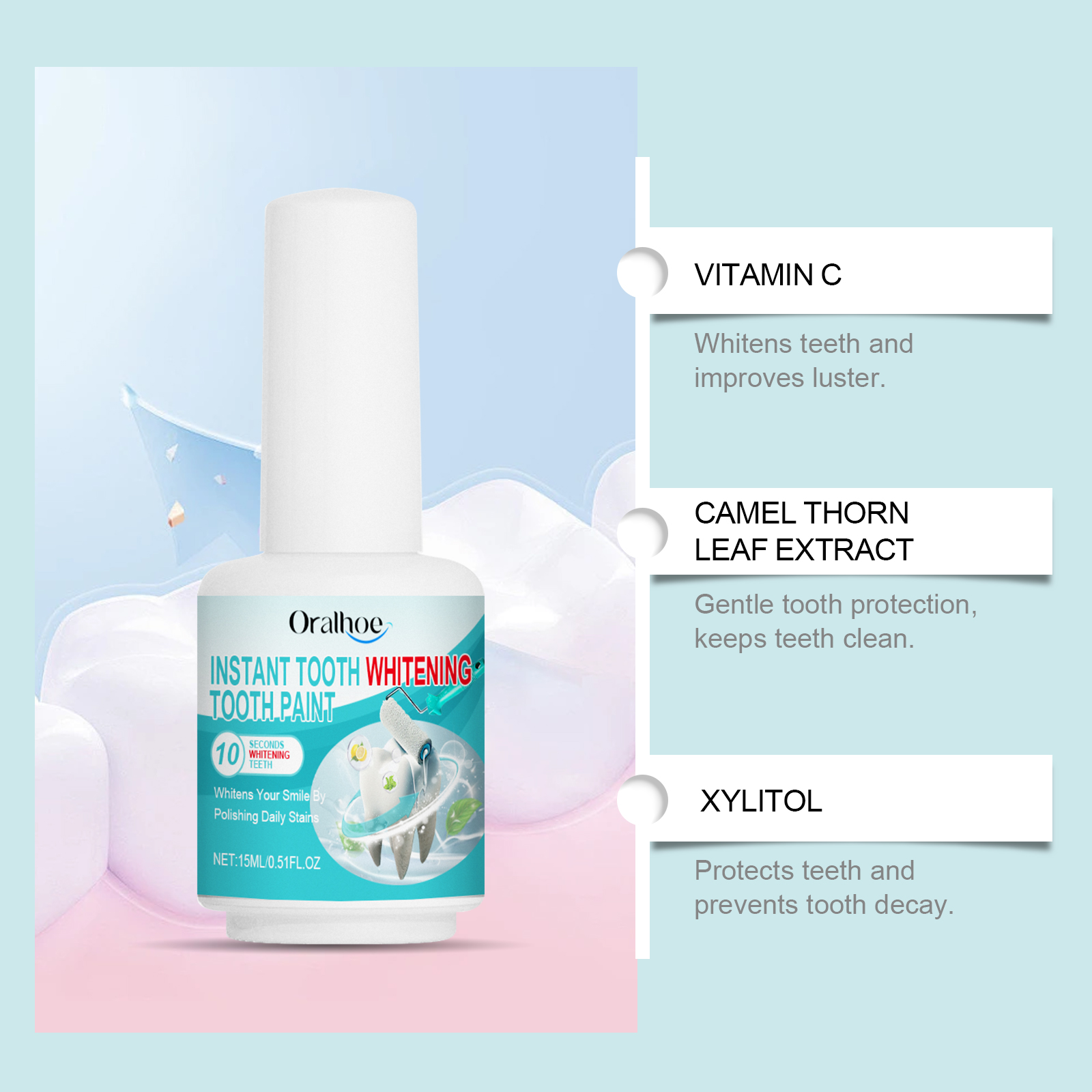 Our tooth cleaning varnish contains vitamin C, Alcamel thorn leaf extract, peppermint oil. It can effectively improve the teeth shine, show confidence smile. Nourish and strengthen teeth and build a protective layer. How to use it is simple: 1. First, make sure your teeth are clean and dry. 2. Apply the product lightly and thinly to each tooth, covering it evenly to avoid streaks. 3. Apply 1-3 times to each tooth, at least 10 seconds between each coat, to allow the tooth to dry. Long-term use, prevent pigmentation, easy to use, quick effect.
